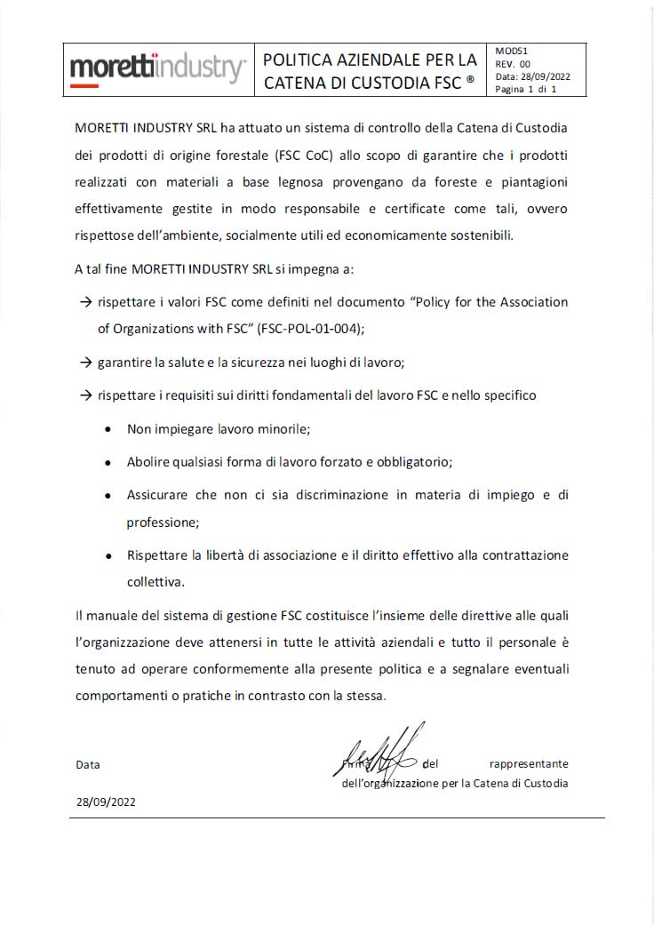 La certificazione FSC®, per le organizzazioni che operano nel settore del legno e della carta, richiede la tracciabilità dei prodotti e garantisce una filiera che rispetta la gestione responsabile delle foreste.I nostri prodotti sono disponibili con certificazione FSC® solo su richiesta.
