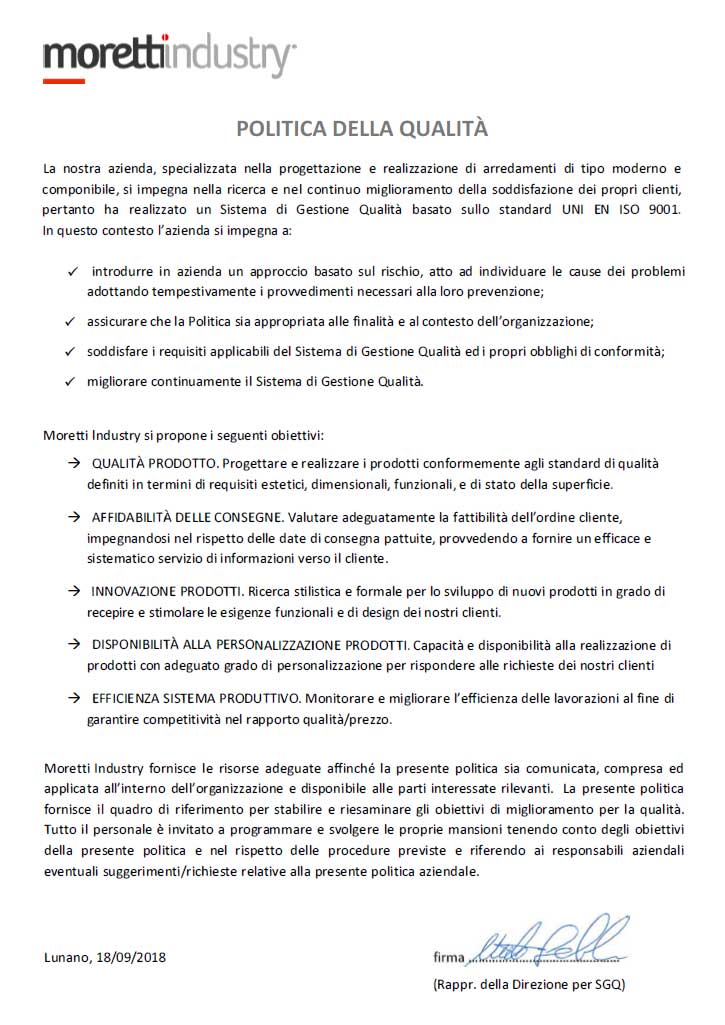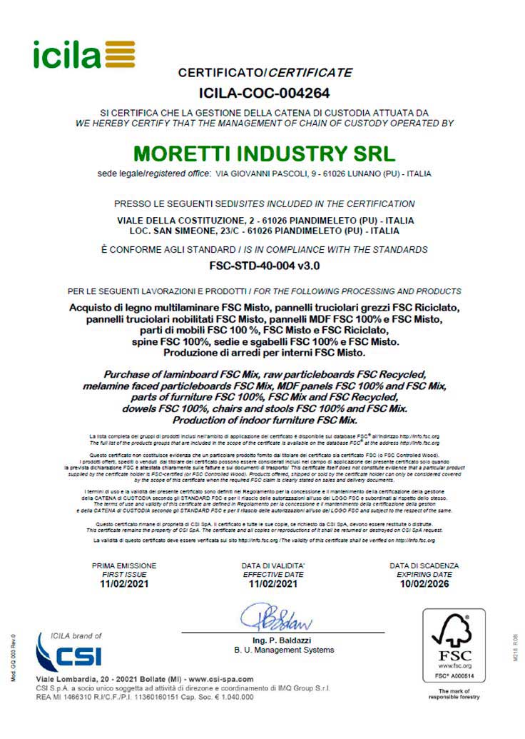 Moretti Industry S.r.l., gestisce un marchio storico del comparto del mobile Pesarese, ubicato a Piandimeleto, comune dell'alto Montefeltro in provincia di Pesaro e Urbino.