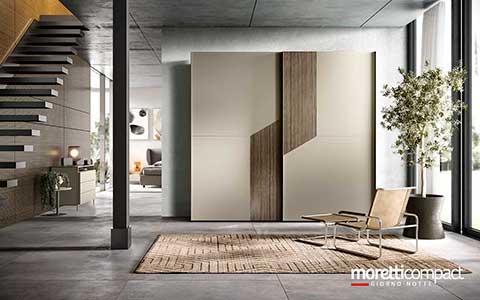 Armadio con due ante scorrevoli Levante Strip e corpo centrale con due ante battenti Libeccio. Gli armadi combinati regalano infinite soluzioni compositive che si adattano a svariate esigenze. Accostamenti tra diversi modelli di ante battente e scorrevole generano sorprendenti composizioni.