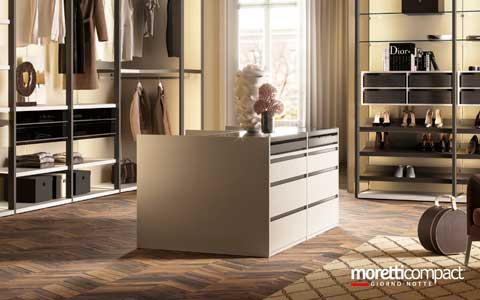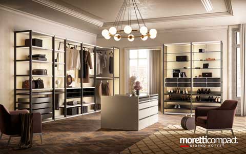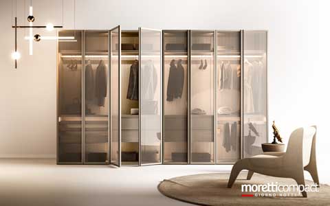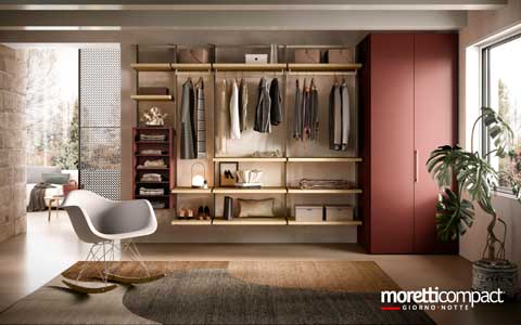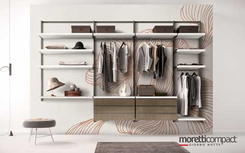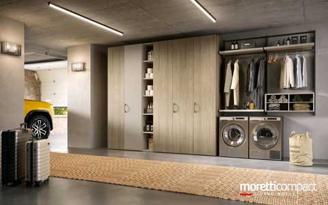 Cabina armadio Orion lineare. Vanta il know-how di Moretti Compact giorno notte: Ideale per attrezzare ambienti destinati a impieghi differenti: una lavanderia oppure una dispensa e si presta bene anche all’arredamento di una boutique.