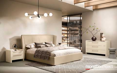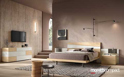 Camera Modula con letto Bipanel. La scelta è ampia per forme e colori, altezze, larghezze, finiture e accessori. Un progetto notte che assicura carattere e personalità e di sicuro impatto scenico. L’apertura dei cassetti avviene tramite presa laterale. Massima libertà di composizione tra fantasia e divertimento.