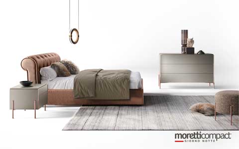 Camera Ventura con letto Rigel. Il programma Ventura si distingue per le componenti in metallo di piedi e maniglie, cassetti e fianchi bordati e smussati a 45°. Prodotti altamente personalizzati che soddisfano il desiderio di estetica e l’esigenza della comodità in camera.